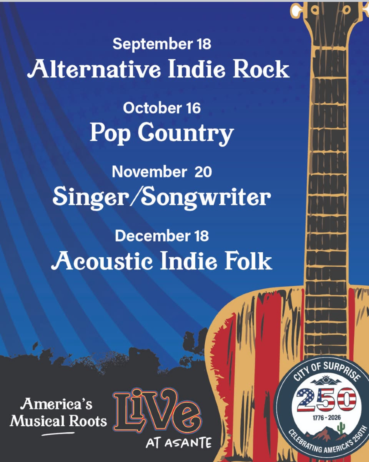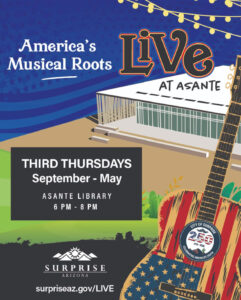 LIVE is a free and casual outdoor performance series at Asante Library in Surprise Az for all ages. This series runs the third Thursday of each month from September 2025  May 2026. Each event will feature a different genre and include a brief history of its importance in America’s music. Featuring live music provided by On Stage Now, free arts activities and food trucks! Bring your lawn chair, your friends and your family for an evening of entertainment.